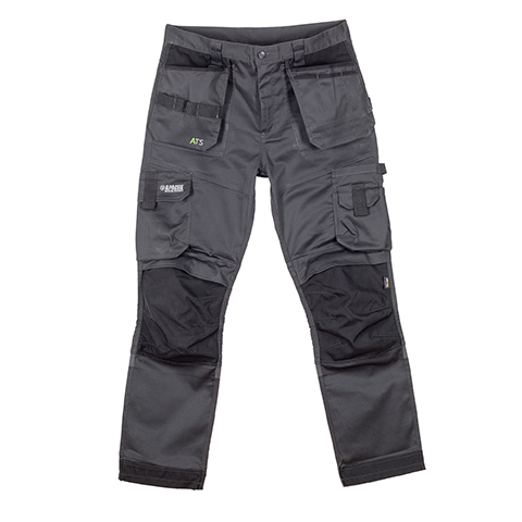 A lightweight work trouser featuring Cordura holster pockets and knee pad pockets. This trouser has a modern tapered leg and the fabric has 4- way comfort stretch. Cordura reinforced hem. Side cargo pocket and padded phone pocket to opposite leg. Triple stitched in key areas. Low rise comfort waist. Tunnel belt loop and YKK zip. A good all -round tradesman trouser.